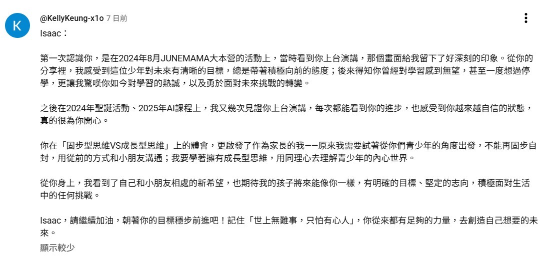 我學習影片製作,是為了打造無圍牆的教室。透過影像說故事,我能將知識轉化為吸引人的內容,有效擴大教育影響力。