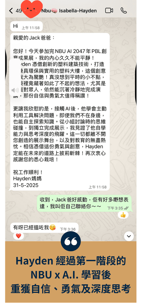 這種學習方式培養的是帶得走的能力。當孩子獨立運用A.I.工具研究,主動協調團隊分工,為自己的專案成果負責時,他們正在成長為真正的問題解決者。